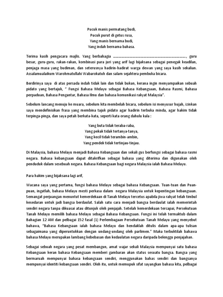 Berikut adalah teks syarahan pemenang pertandingan syarahan bahasa malaysia sekolah saya. Penanda Wacana Untuk Rumusan Spm. Yang mulia tuan pengerusi majlis.